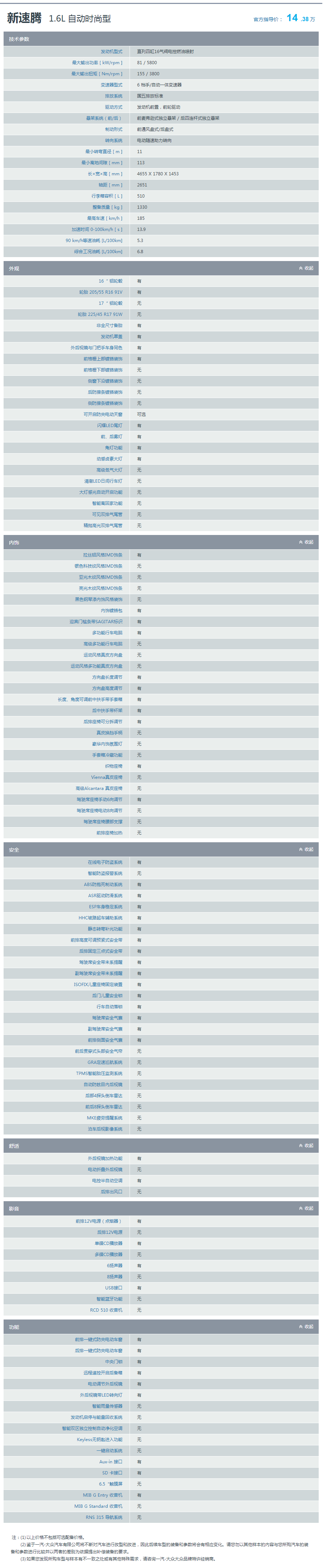 新速腾外观设计简洁硬朗,同时又不失动感时尚,与驾驶者的精神面貌相互契合
